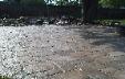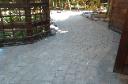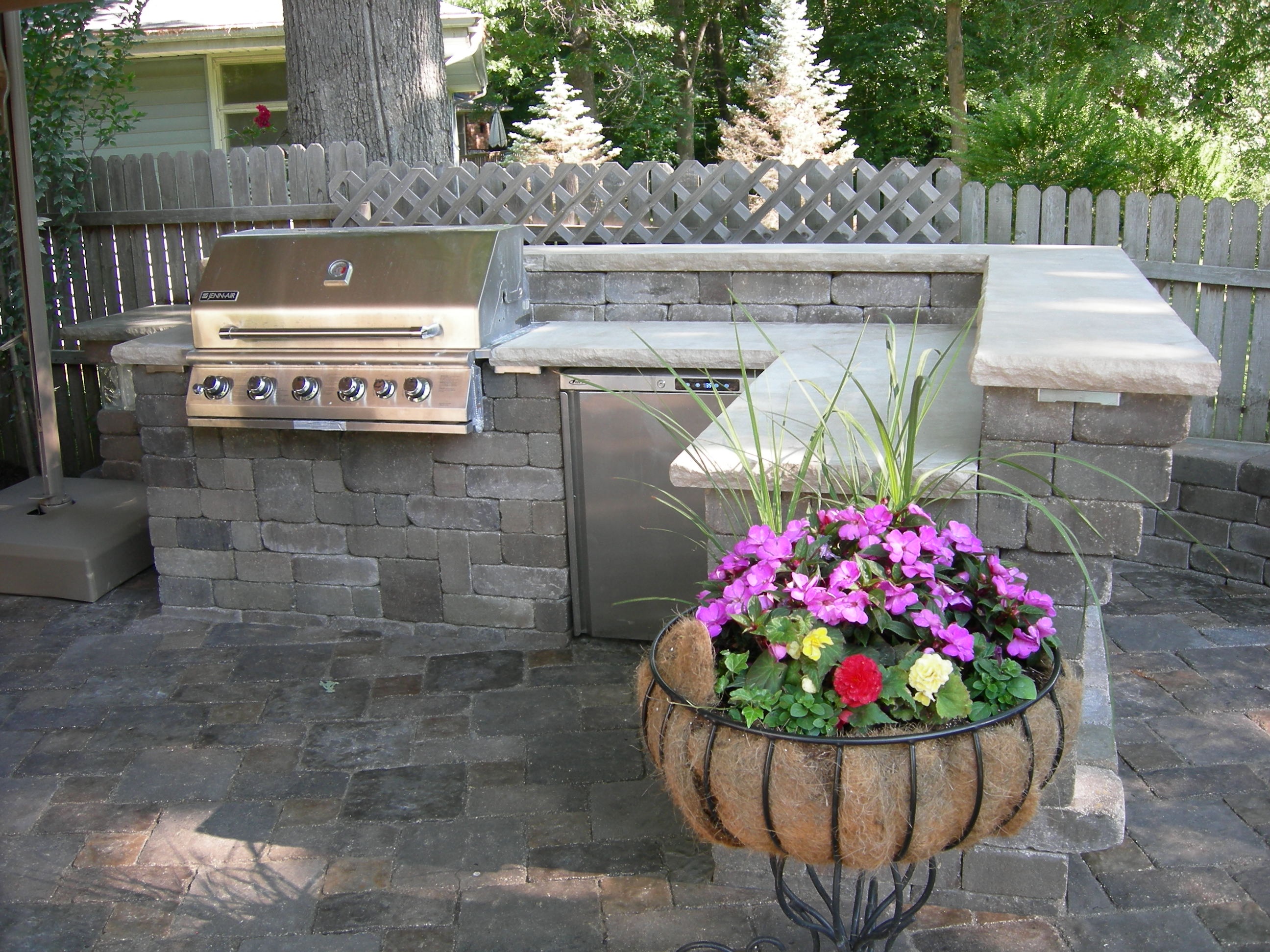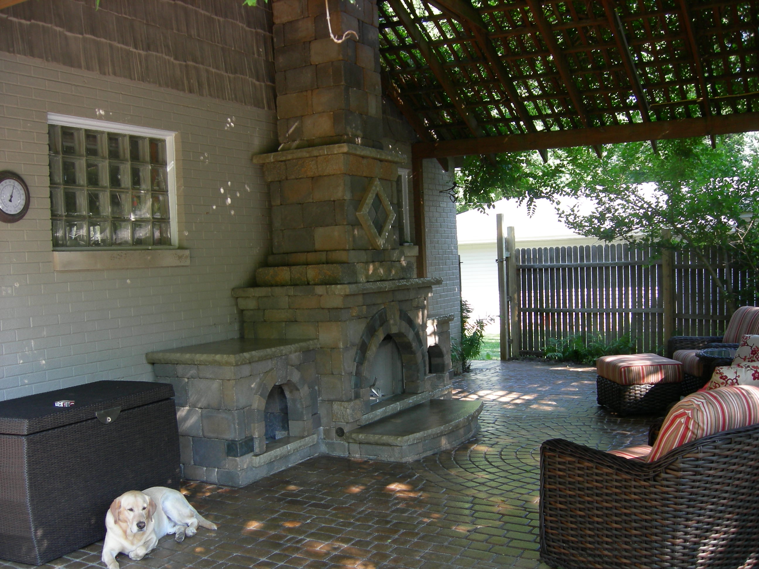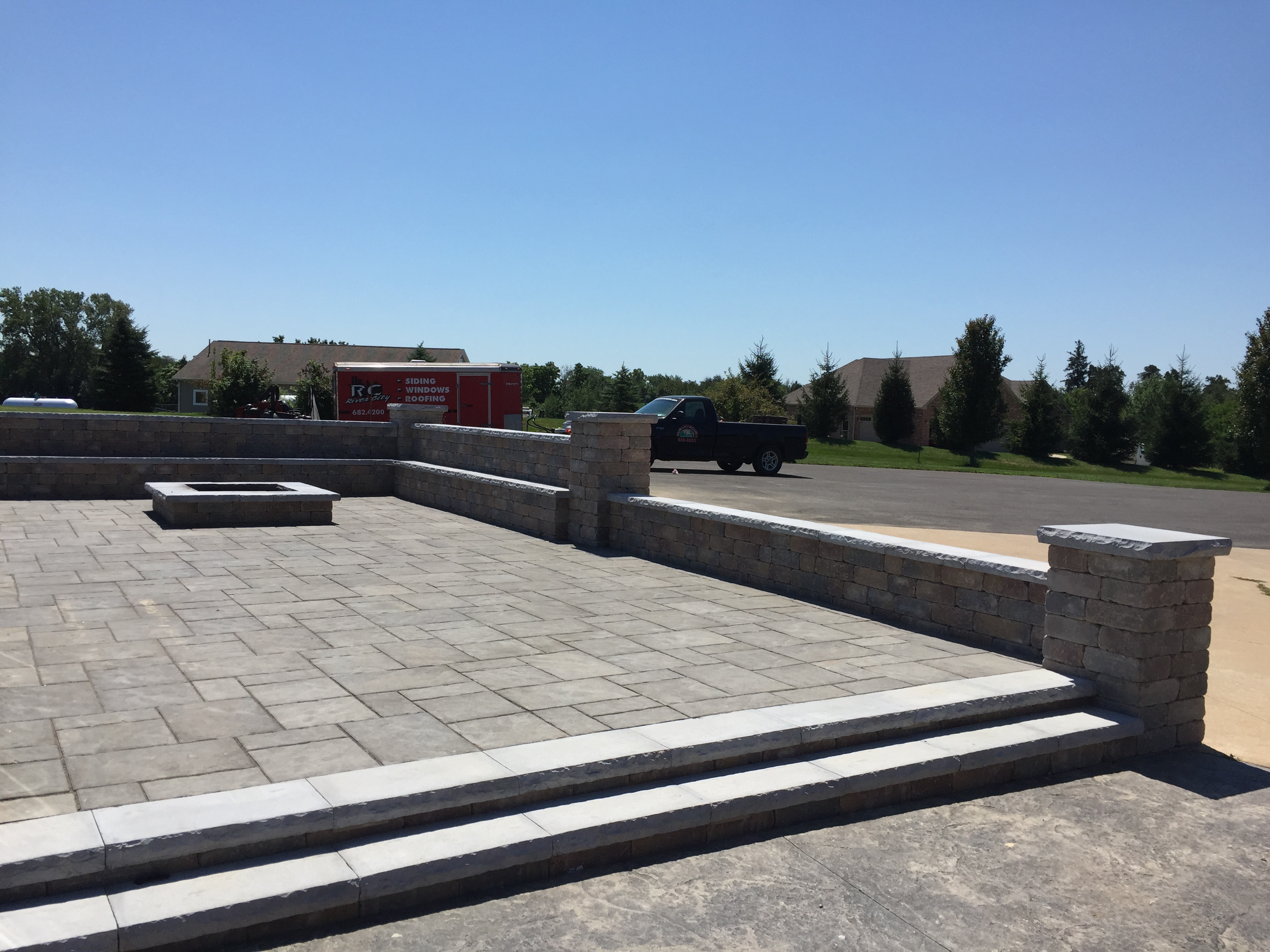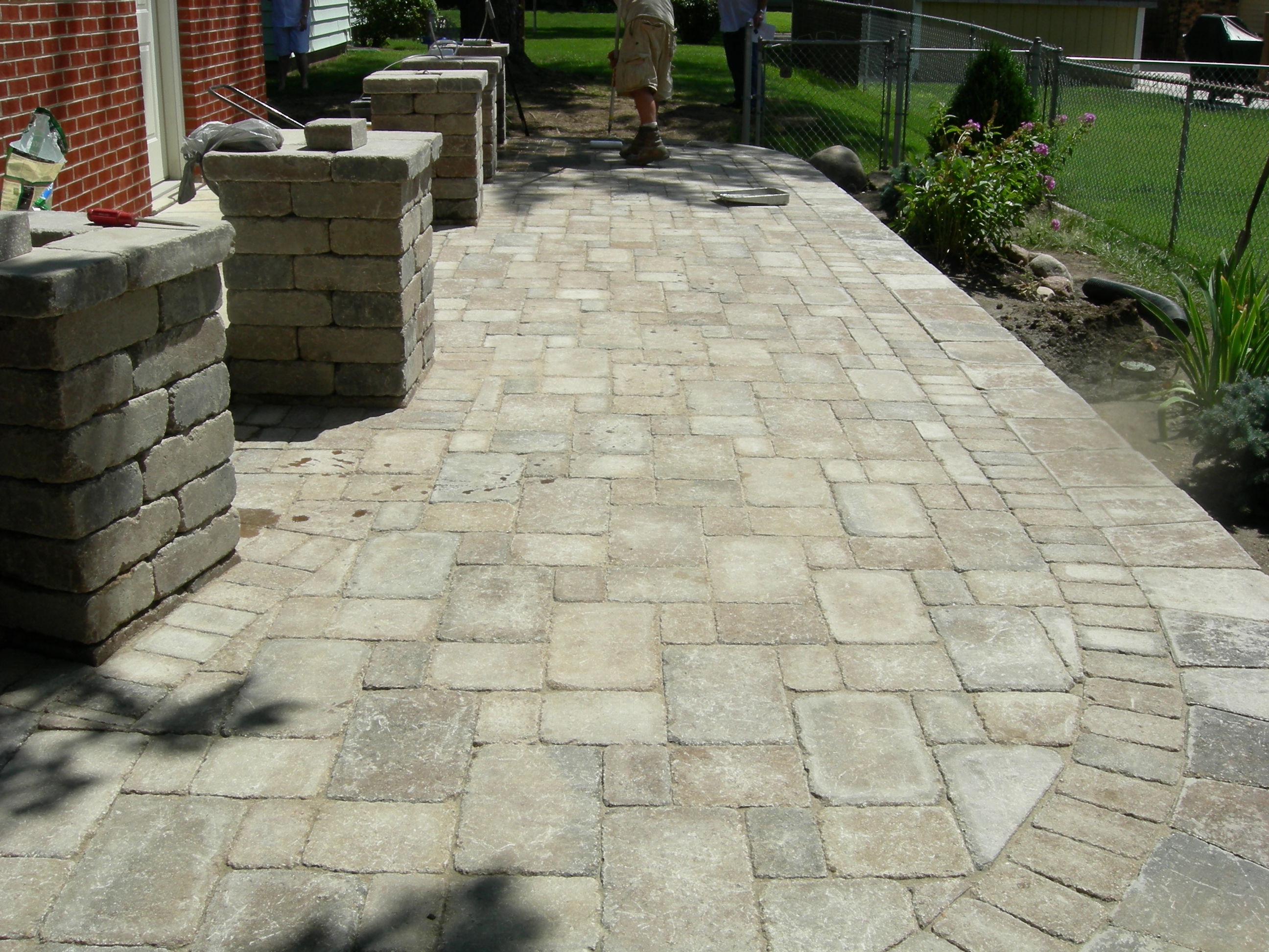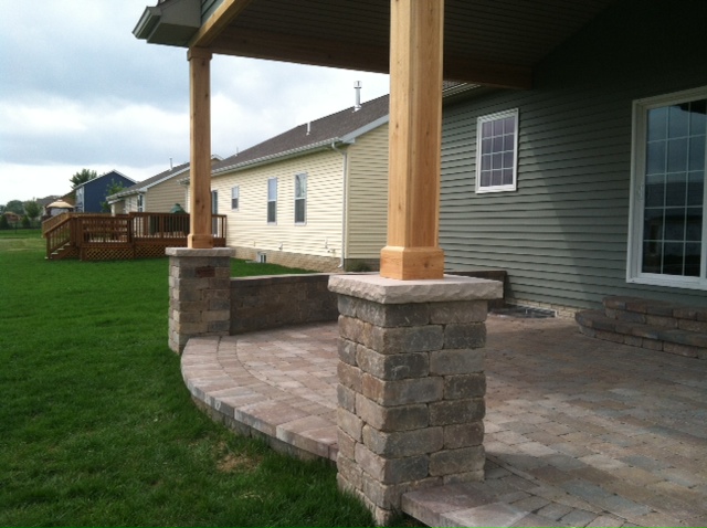 Patio constructed with Unilock Brussels stone. Pillars constructed with Unilock Brussels Dimensional block.