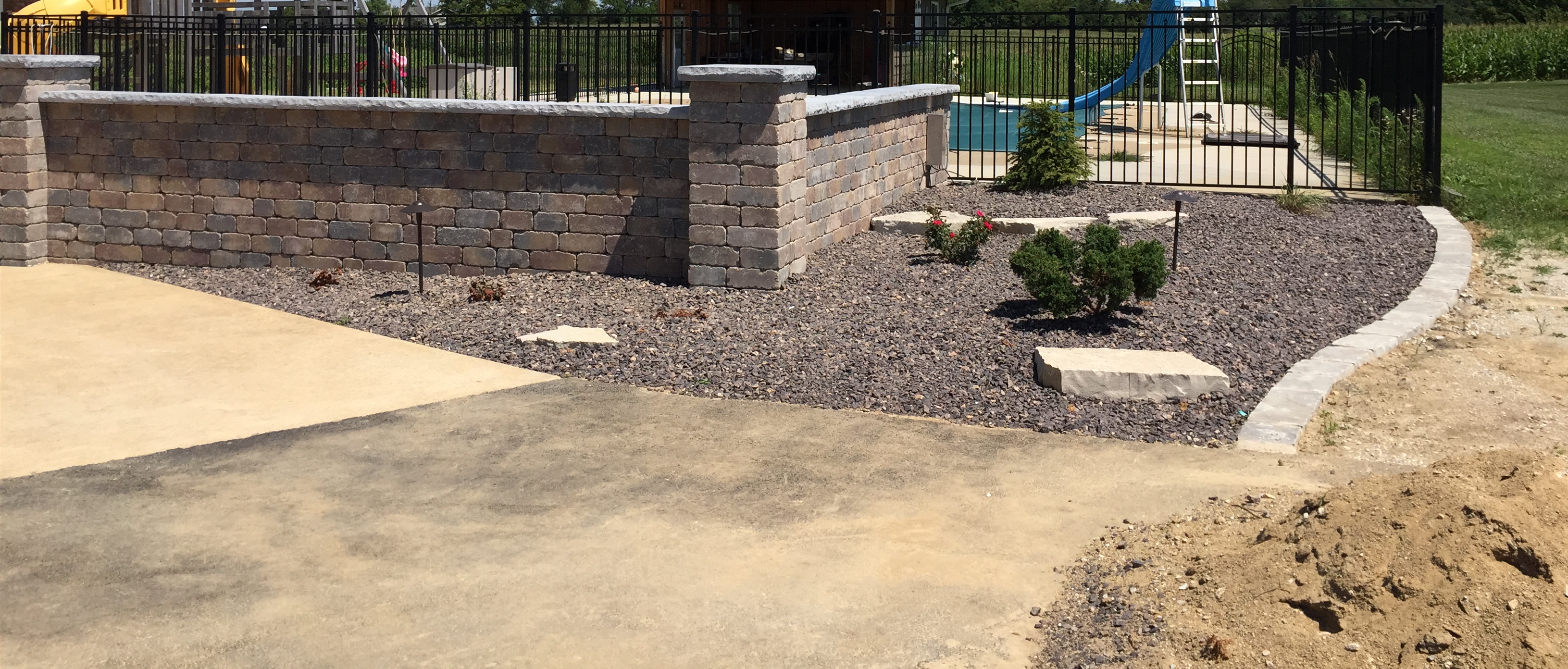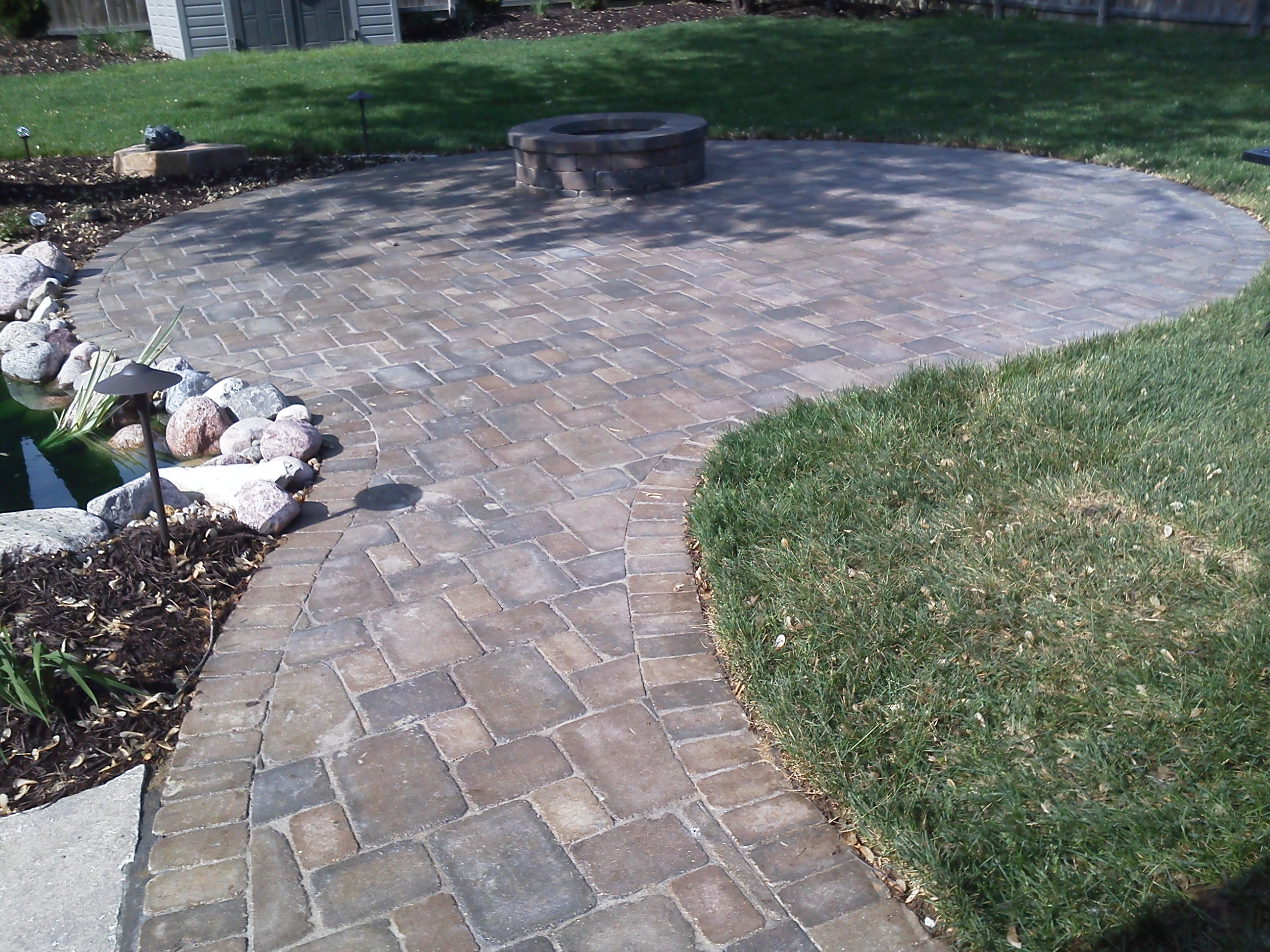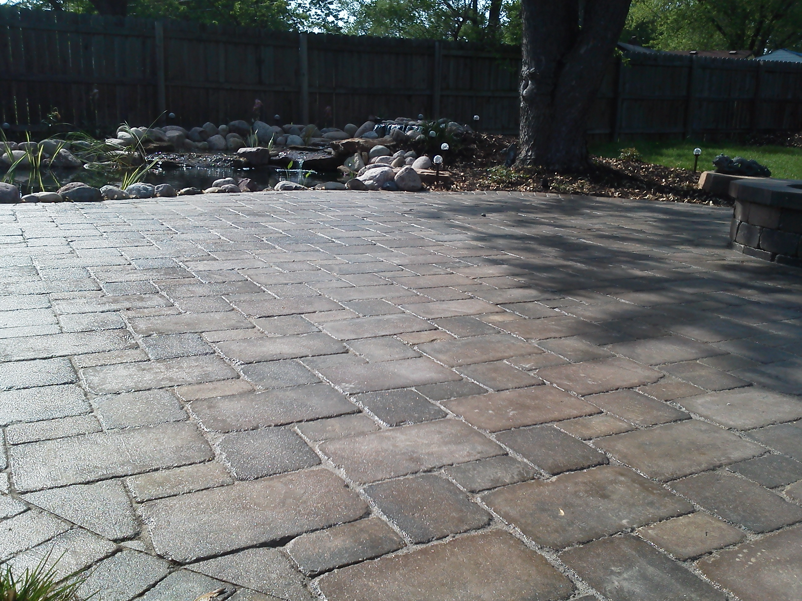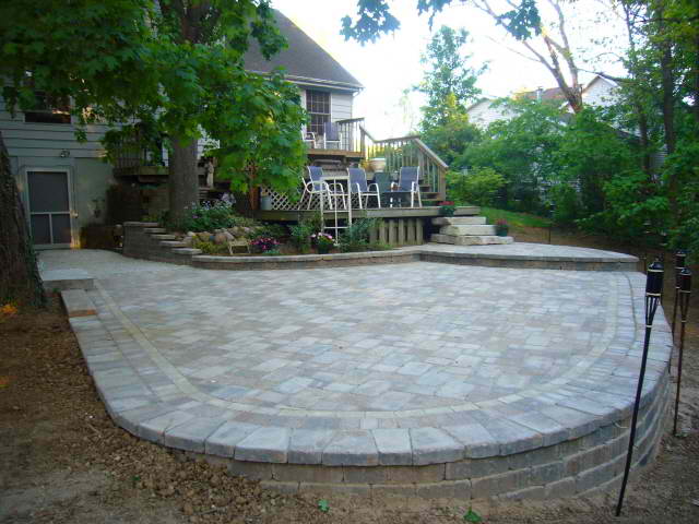 Patio and sidewalk installed with Paveloc brick in a Fieldstone color. Seating wall constructed with Creta