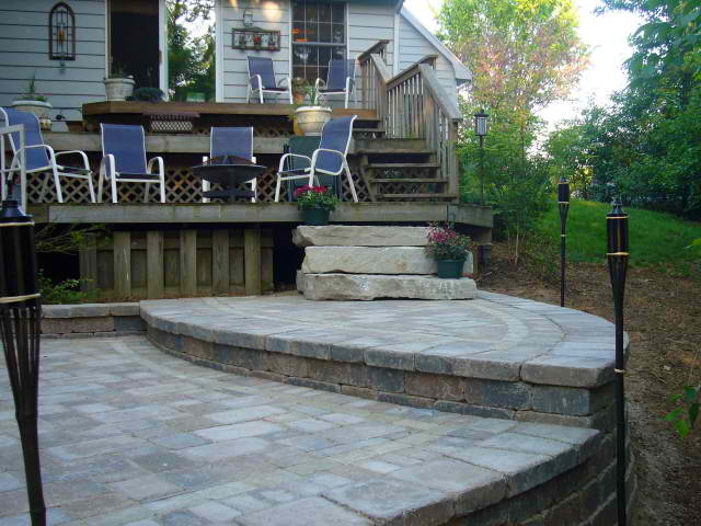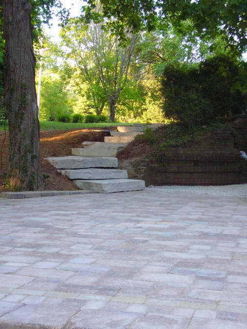 Patio Built in Unilock Brussel Stone. Stairs Installed with Fond du Lac Outcropping Flagstone.