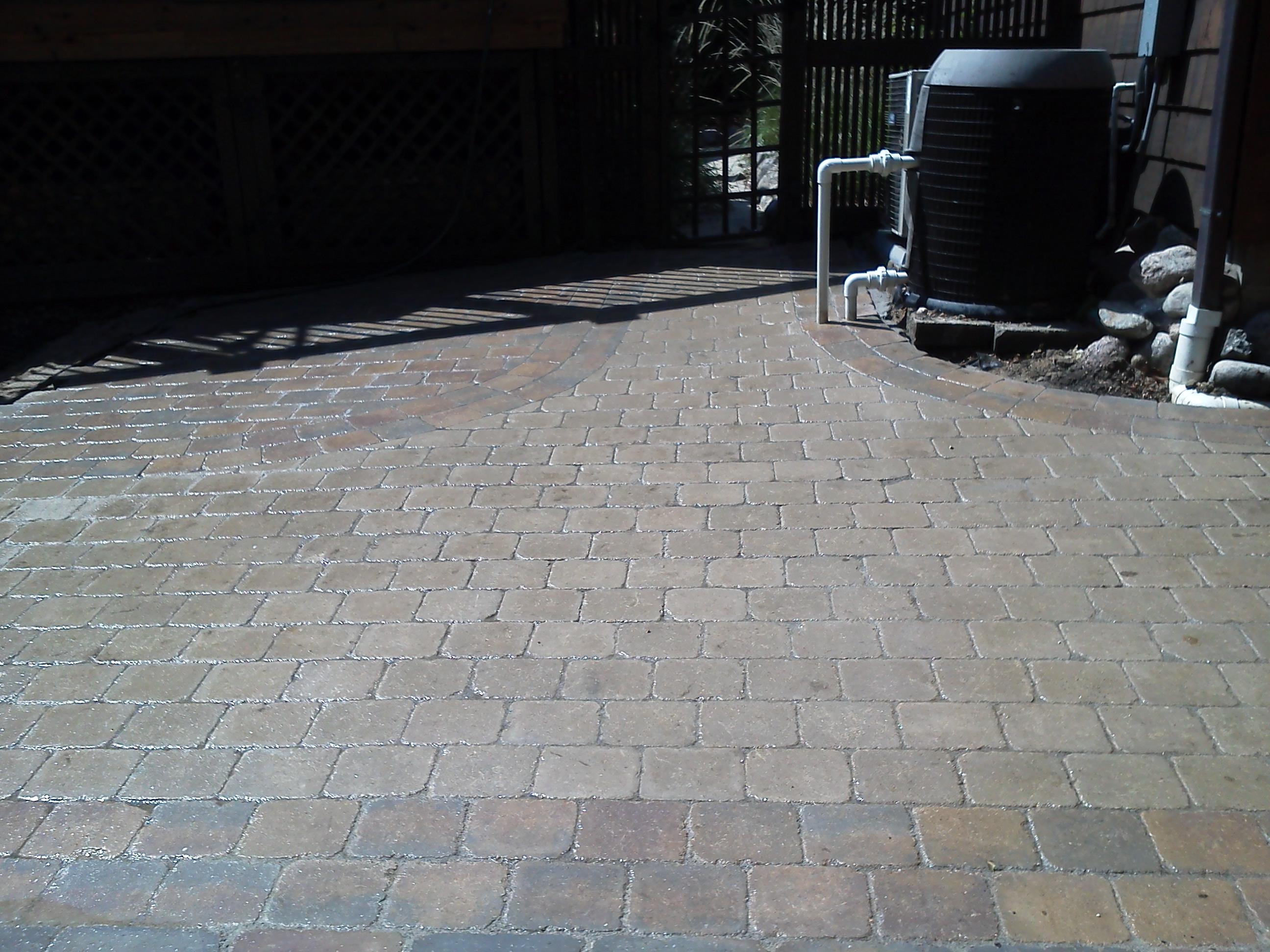 Patio and sidewalk installed with Paveloc Bravado Brick in a three stone herringbone pattern.